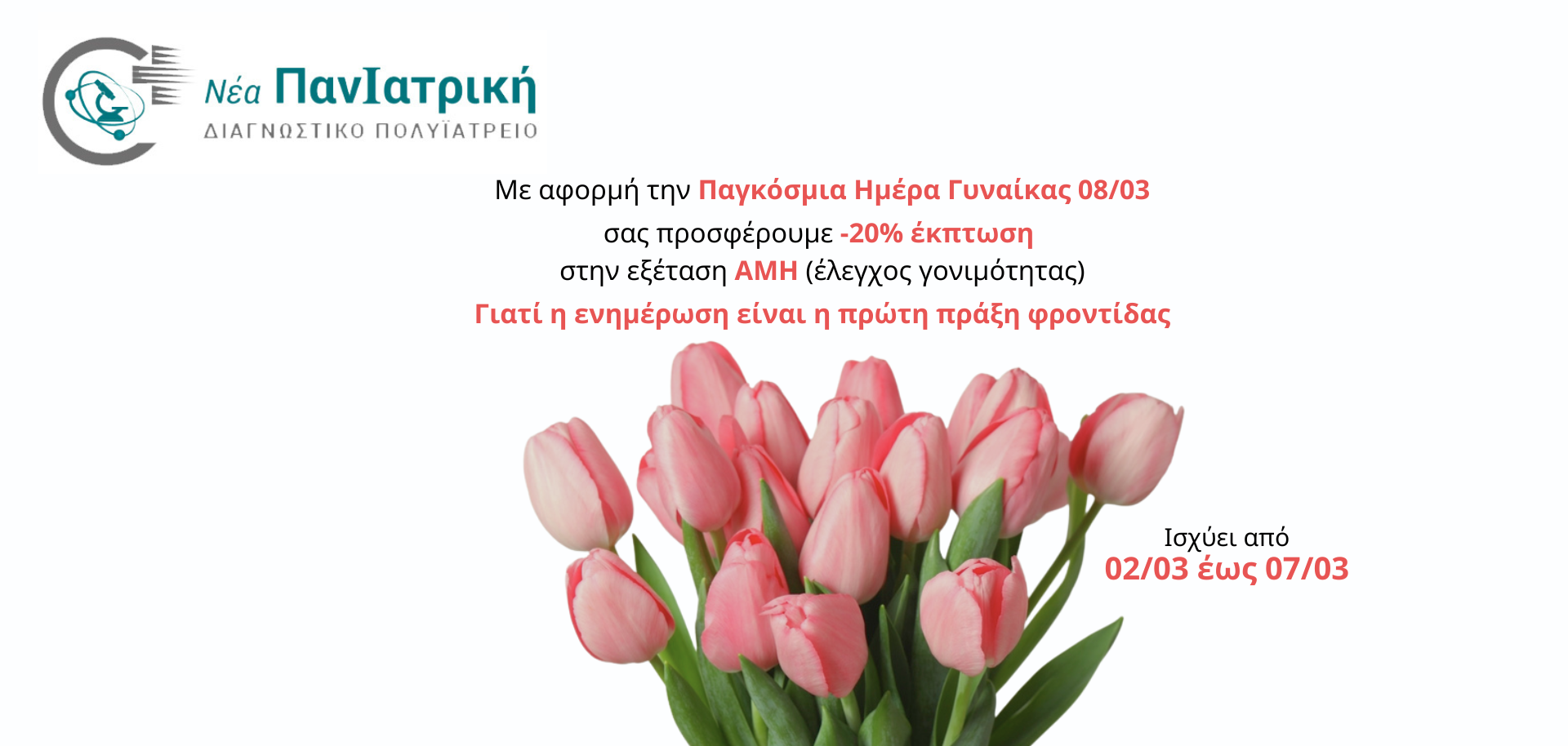 Στο πλαίσιο της πρόληψης και της ενημέρωσης, σας προσφέρουμε – 20% έκπτωση στον έλεγχο γονιμότητας στην αιματολογική εξέταση ΑΜΗ.Ισχύει από 02/03 έως 07/03.Γιατί η ενημέρωση είναι η πρώτη πράξη φροντίδας!